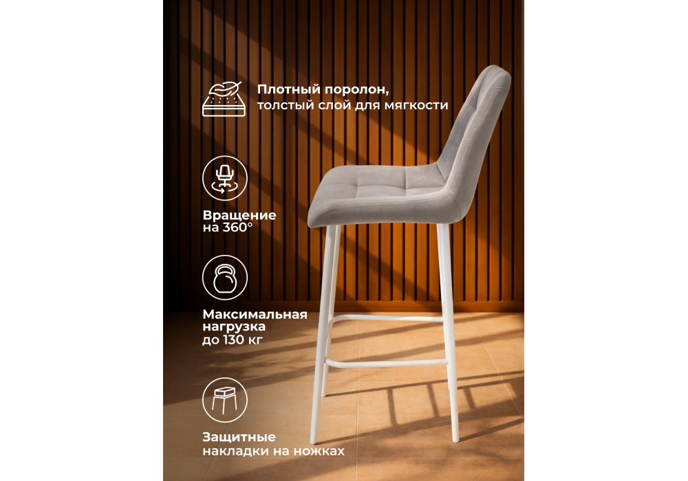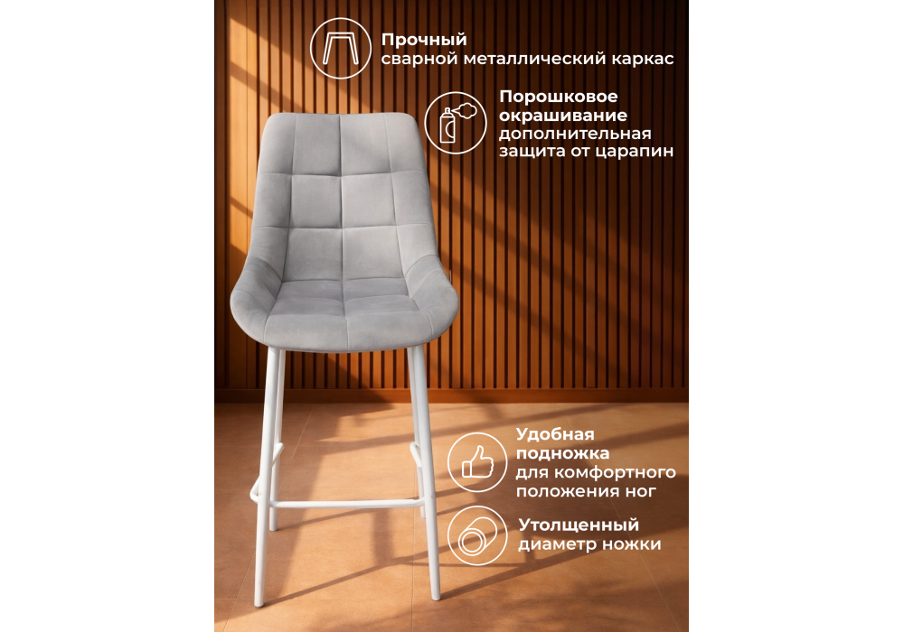 Материал каркаса - металл; Материал сиденья - велюр; Материал обивки - велюр; Цвет ножек - белый; Ширина - 50; Глубина - 58; Высота - 99; Ширина сиденья - 46; Глубина сиденья - 41; Высота сиденья - 63;