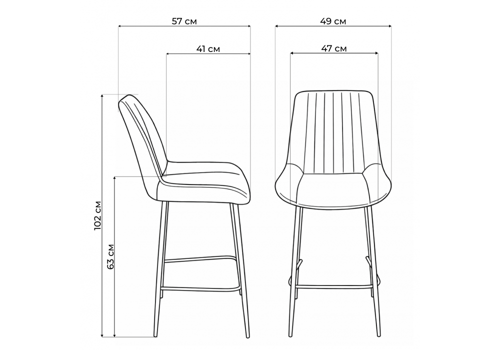 Материал каркаса - металл; Материал сиденья - велюр; Материал обивки - велюр; Ширина - 49; Глубина - 57; Высота - 102; Ширина сиденья - 47; Глубина сиденья - 41; Высота сиденья - 63;