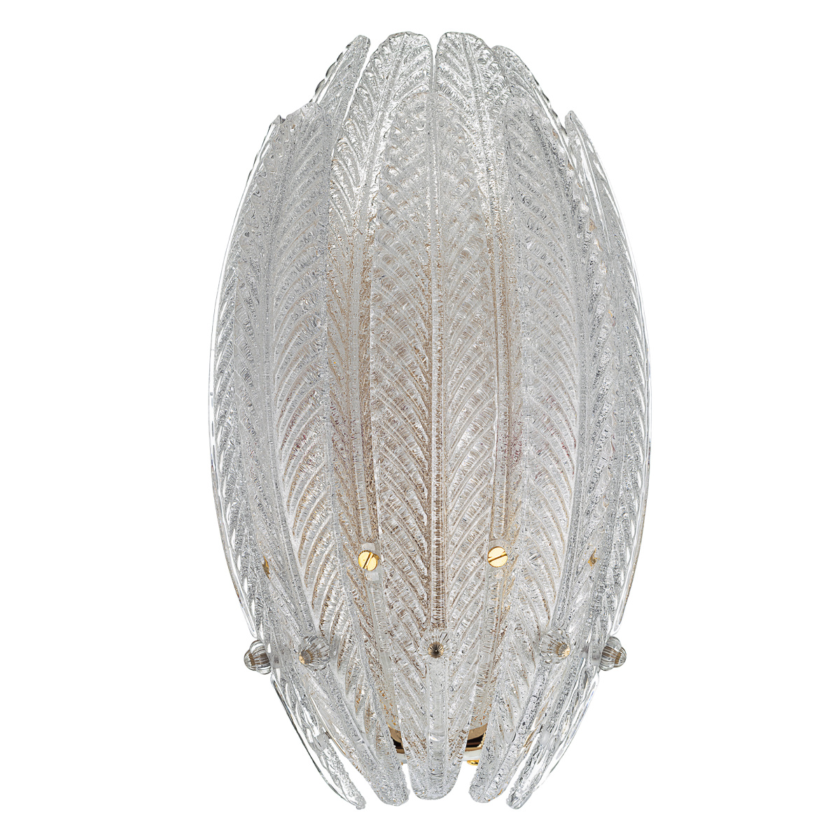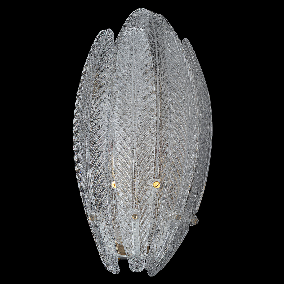 Металлический каркас имеет благородный золотой оттенок, рассеивателем служат несколько рядов полупрозрачных стеклянных текстурных элементов в форме продолговатых листьев. Для светильника подойдут две лампочки с цоколем Е14, максимально допустимая мощность для лампы накаливания — 40Вт, светодиодные могут быть более яркие.