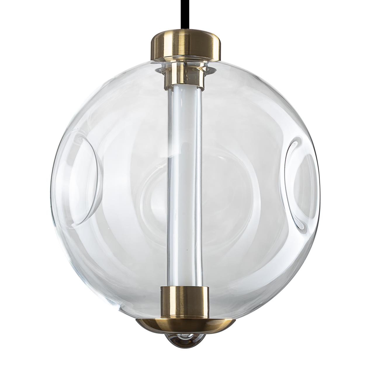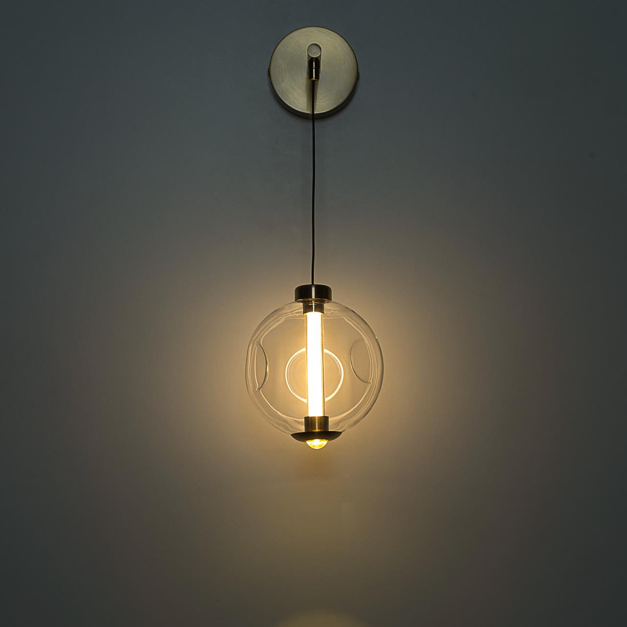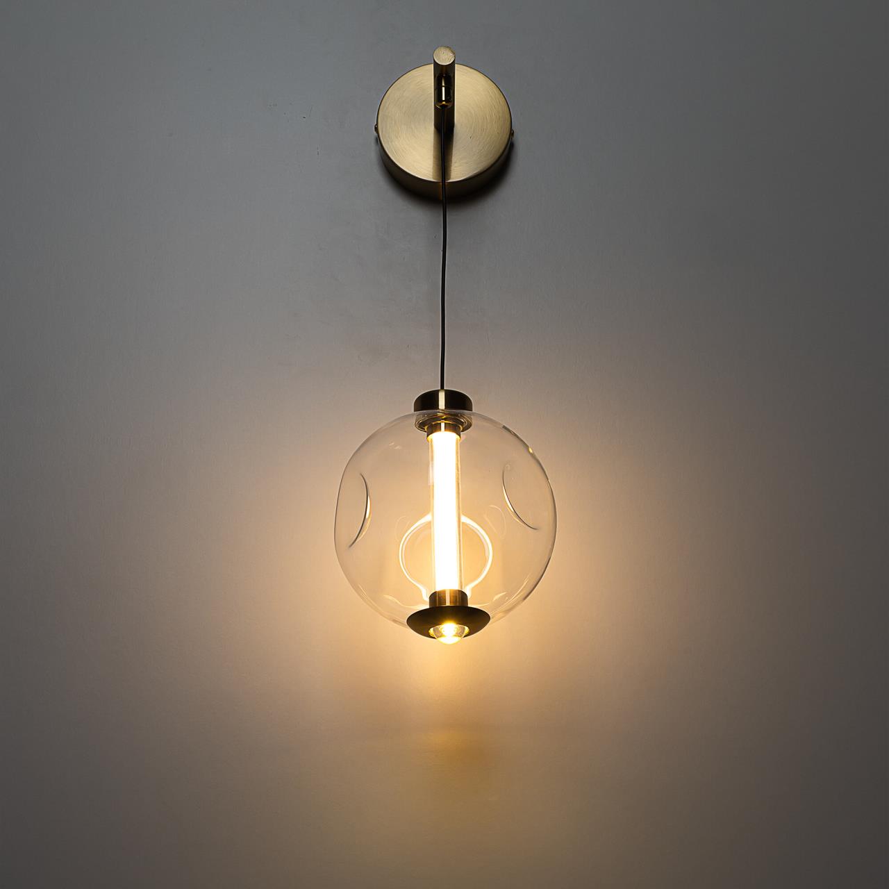 Металлический корпус имеет благородный бронзовый оттенок. Внутри прозрачного стеклянного плафона в форме шара закреплен светодиодный сердечник с цветовой температурой 3000К (теплый свет). Общая мощность светильника — 5Вт. Высоту плафона можно отрегулировать.