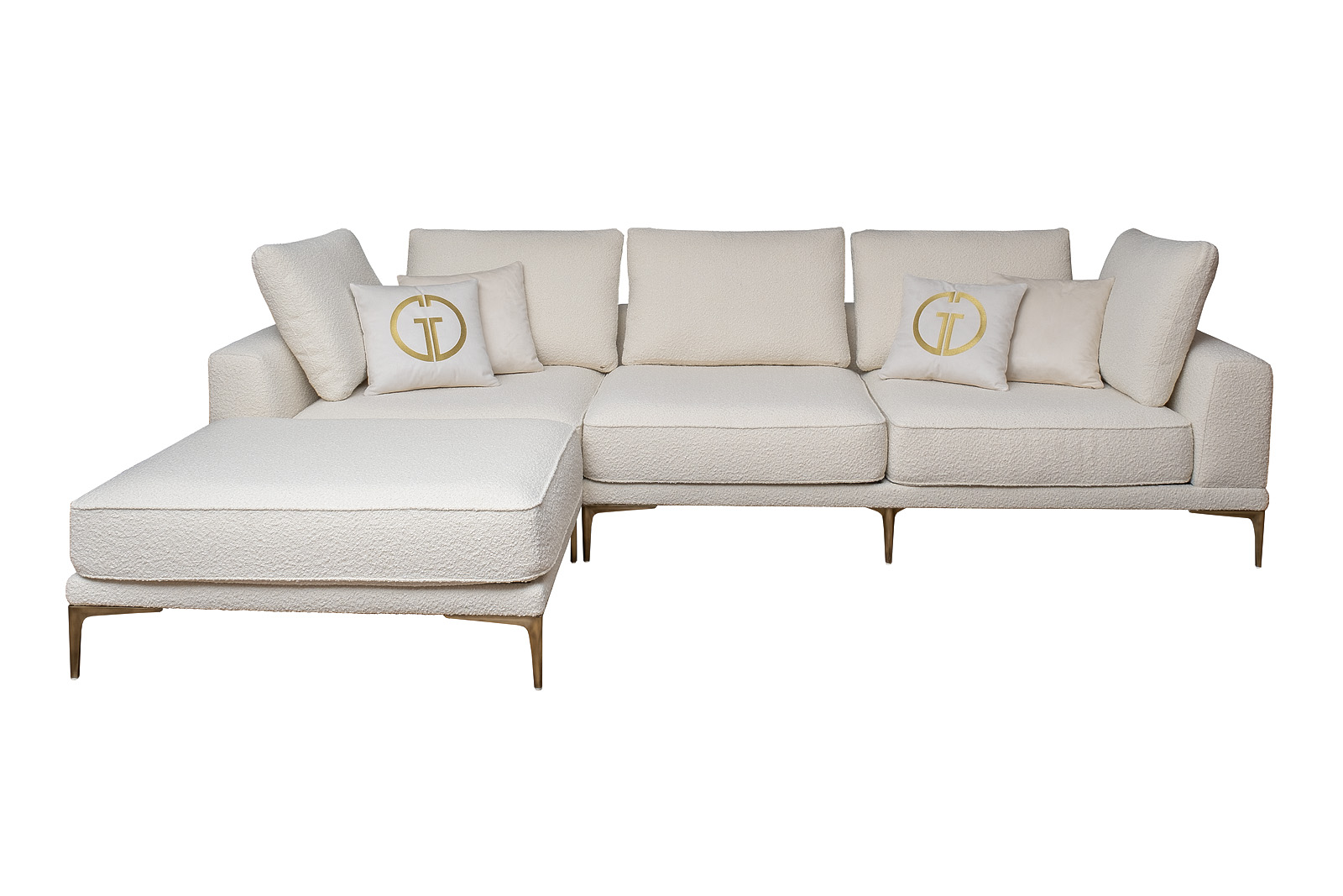 Комплект мебели №53 модульный Диван Тесоро(Tesoro) (левый угол). В состав комплекта входит: модуль угловой левый DR-1шт, модуль угловой правый KL+P- 1шт. Комплект выполнен в ткани из коллекции Garda Decor- букле Orso-Ecru. В состав комплекта входят декоративные подушки: 45*45см в ткани Атмосфера(Atmosphera)010-2шт, 45*45см в ткани Атмосфера(Atmosphera)000-2шт с вышивкой эмблема в цвет золото. Металлические опоры 18см, цвет бронза. Габариты комплекта: ширина- 3100мм, глубина-2000мм, высота- 900мм. Глубина сиденья- 750мм, высота посадочного места- 440мм.
