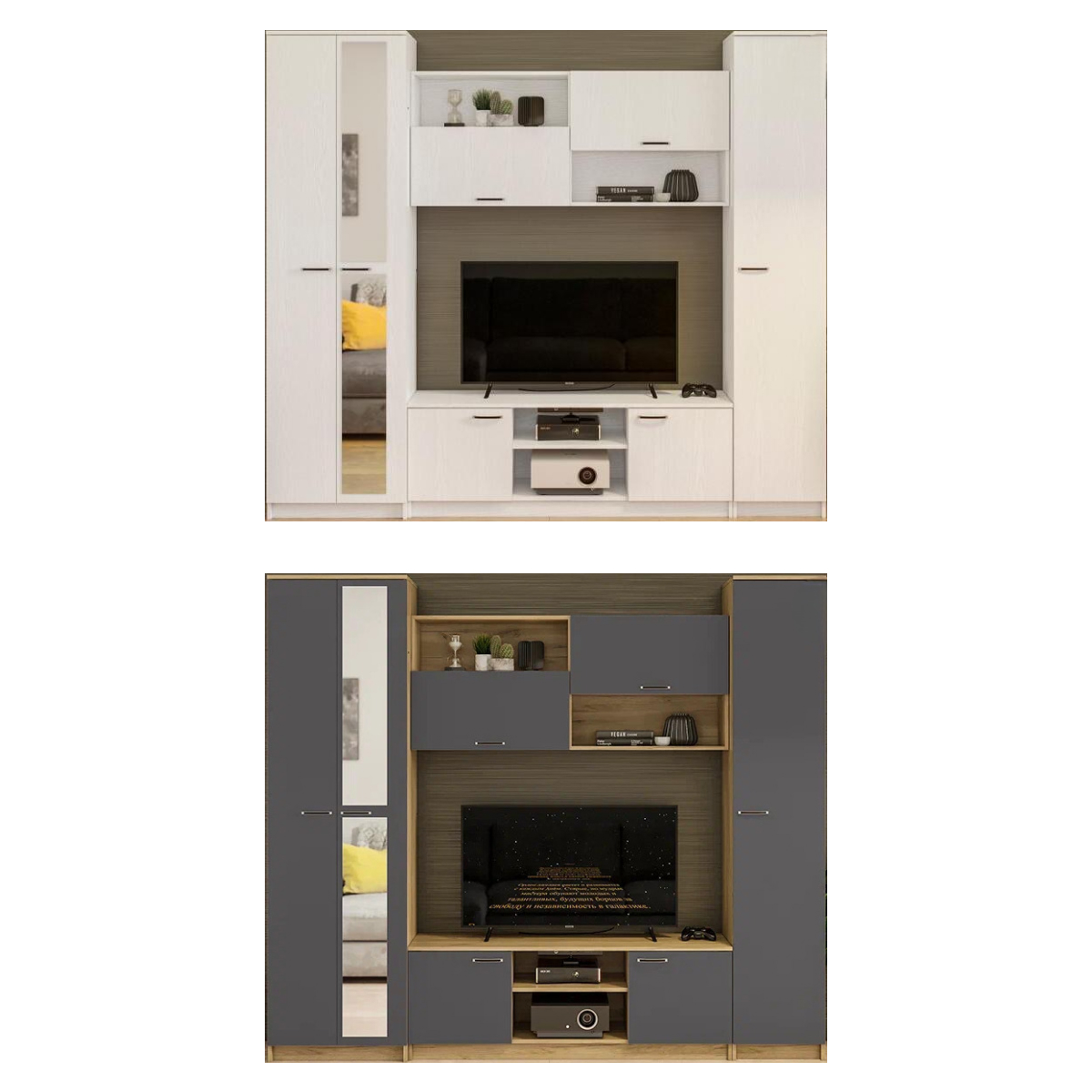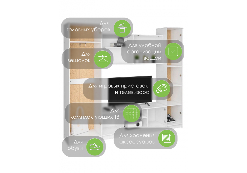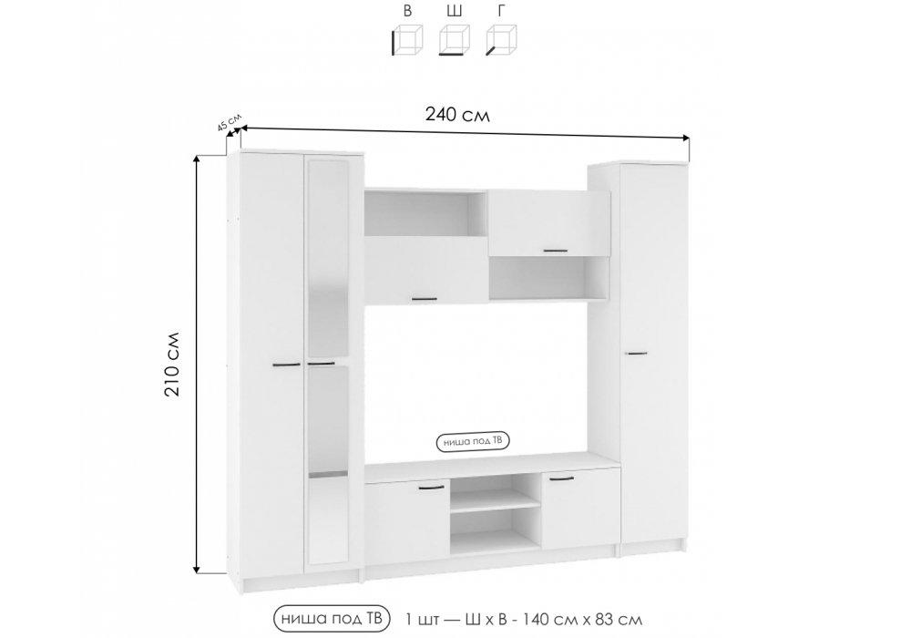 Размер ниши под ТВ: 140 х 83 см. Материал каркаса - ЛДСП; Ширина - 240; Глубина - 45; Высота - 210;