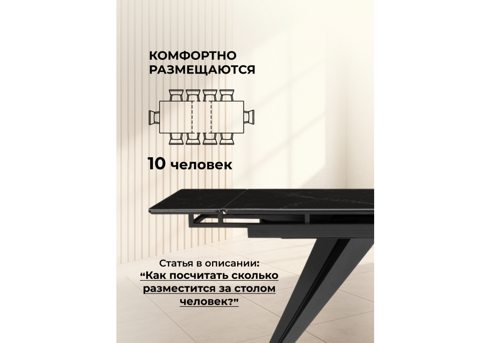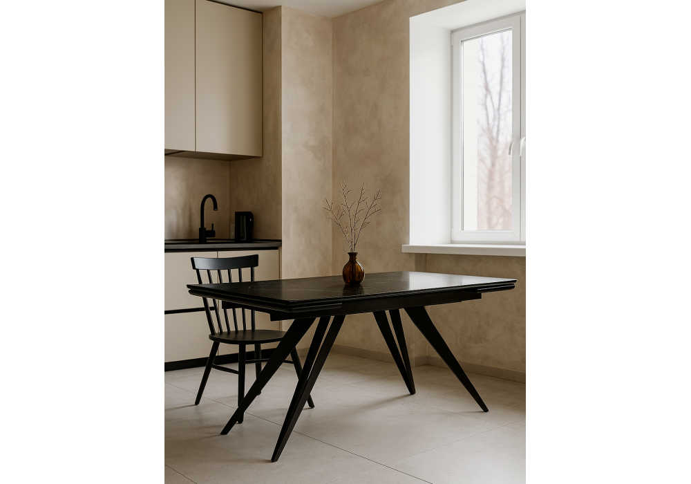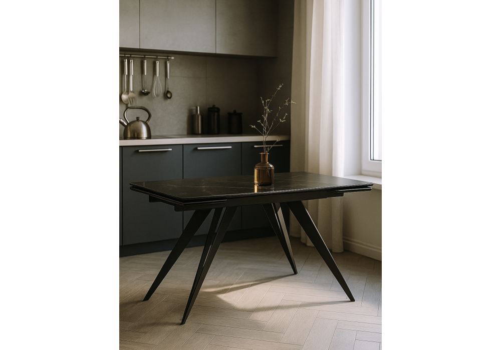 Материал каркаса - металл; Материал столешницы - Керамика; Цвет ножек - черный; Ширина - 80; Высота - 75; Длина стола в разложенном виде - 200; Длина - 140;