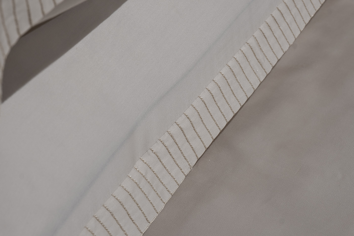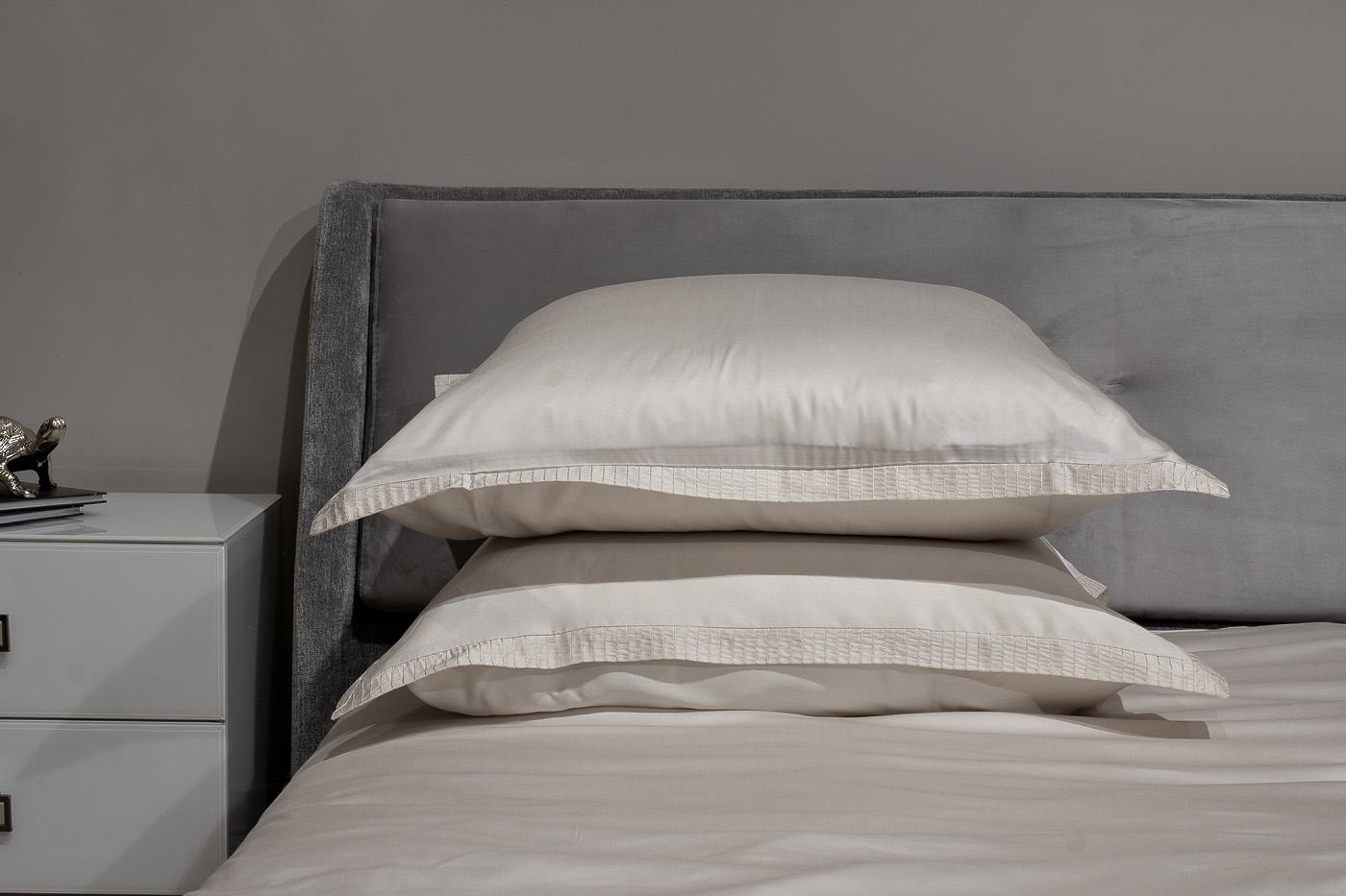 Комплект наволочек с клапаном сшит из 100% ткани тенсель. По периметру наволочки уникальная вышивка в цвет ткани, формирующая бордюр шириной 3 см.