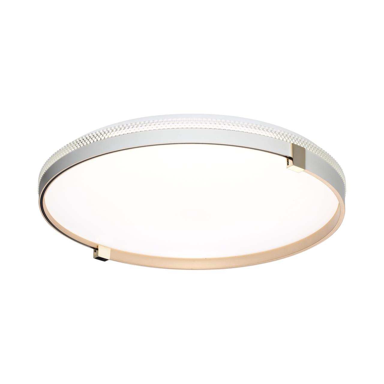 Светильник 7646/DLN линии OLIDI WHITE состоит из металлического основания (базы) и пластикового рассеивателя. Материал рассеивателя - высококачественный пластик марки PMMA 2.0 белого цвета с матовой поверхностью, без текстуры. Пластик обеспечивает светильнику равномерное рассеивание и хорошее светопропускание. Форма плафона: круглая, декорирована ободом из пластика белого и золотистого цветов с прозрачной вставкой под хрусталь. Обод украшен металлическими клипсами, цвет золото. Степень защиты IP43 позволяет использовать светильник в определенных зонах влажных помещений. В комплект входит LED модуль с линзами, мощностью 48Вт, которая соответствует лампе накаливания 515Вт. А также переключатель температуры цвета (ССT) на драйвере, с помощью которого осуществляется изменение цветовой температуры 3000/4000/6000К и переход светильника в режим теплого/белого/холодного света. Для установки необходимого режима рекомендуется использовать удлиненный тонкий предмет типа небольшой отвертки.