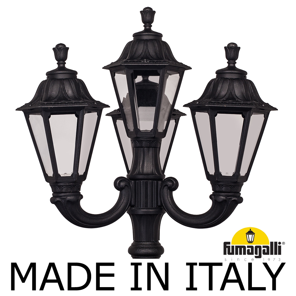Парковый фонарь FUMAGALLI среднего размера серии RUT, модель TABOR OFIR/RUT 3L+1. Парковый фонарь с 3 светильниками на консолях OFIR + 1 венчающий, установленных на классическом столбе TABOR высотой 3,0 м (+высота фонарей на кронштейнах). Изготовлены в Италии, по уникальным технологиям "FUMATECH" из современного композитного полимера RESIN. Этот материал в 5 раз прочнее металла, не ржавеет, не окисляется, не выгорает на солнце, его не нужно красить. Все светильники пыле-влаго защищены по стандарту IP55 (Пылезащищенные, защита от водяных струй с любого направления). Рассеиватель выполнен из антивандального, не мутнеющего и не горючего PMMA (ПолиМетилМетаАкрилат). Срок службы светильника - не менее 20 лет. Температура использования от -60 до +90. В серии RUT есть садовые фонари в настенном (OFIR/RUT, MIRRA/RUT) подвесном (SICHEM/RUT) и наземном исполнении (IAFAET.R/RUT, ALOE.R/RUT, ARTU/RUT, GIGI/RUT, RICU/RUT, NEBO/OFIR/RUT 1L, NEBO/OFIR/RUT 2L, TABOR/ADAM/RUT 3L) со столбами разной высоты, с разным количеством и конфигурацией голов. Консоли настенных фонарей и кронштейны светильников на столбах освещения могут устанавливаться в положение вверх и вниз. Столбы выше 150 см имеют в основе мощную стальную трубу с двойной оцинковкой. При заказе требуется выбрать цвет корпуса, цвет плафона. По стилю и дизайну серия уличных светильников RUT похожа на светильники большого размера серии NOEMI и малого размера серии ANNA . По размеру относится к средним парковым светильникам как серия CEFA и GLOBE 300.