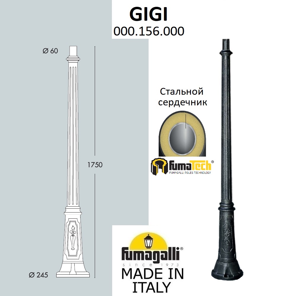 Парковый столб FUMAGALLI, модель GIGI. Опора наземная высотой 1750 мм для светильника малого, среднего и большого размера. Классический дизайн "под литье", имитация чугунных парковых опор позапрошлого века. Закладные детали для монтажа входят в комплект поставки. Изготовлена по технологии FUMATECH, с использованием материалов с разными физическими свойствами. В центре изделия расположена стальная (оцинкованная с двух сторон) труба, которая гарантирует прочность и жесткость конструкции. С внешней стороны используется сверхпрочный технологичный полимерный материал RESIN, который защищает поверхность от агрессивного воздействия всех атмосферных факторов (покрытие не ржавеет, не выгорает на солнце, не боится солей и реагентов). Пространство между этими материалами под высоким давлением заполнено плотной, не впитывающей воду полиуретановой пеной, которая прочно соединяет все конструкцию в единое целое. Не проводит электричество!!! Фонарный столб и светильники не требуют заземления и относятся к 2 классу электробезопастности. Посадочный размер для фонарей и консолей уличных светильников равен 60мм.. Срок службы - не менее 20 лет. Температура использования от -60 до +90.
