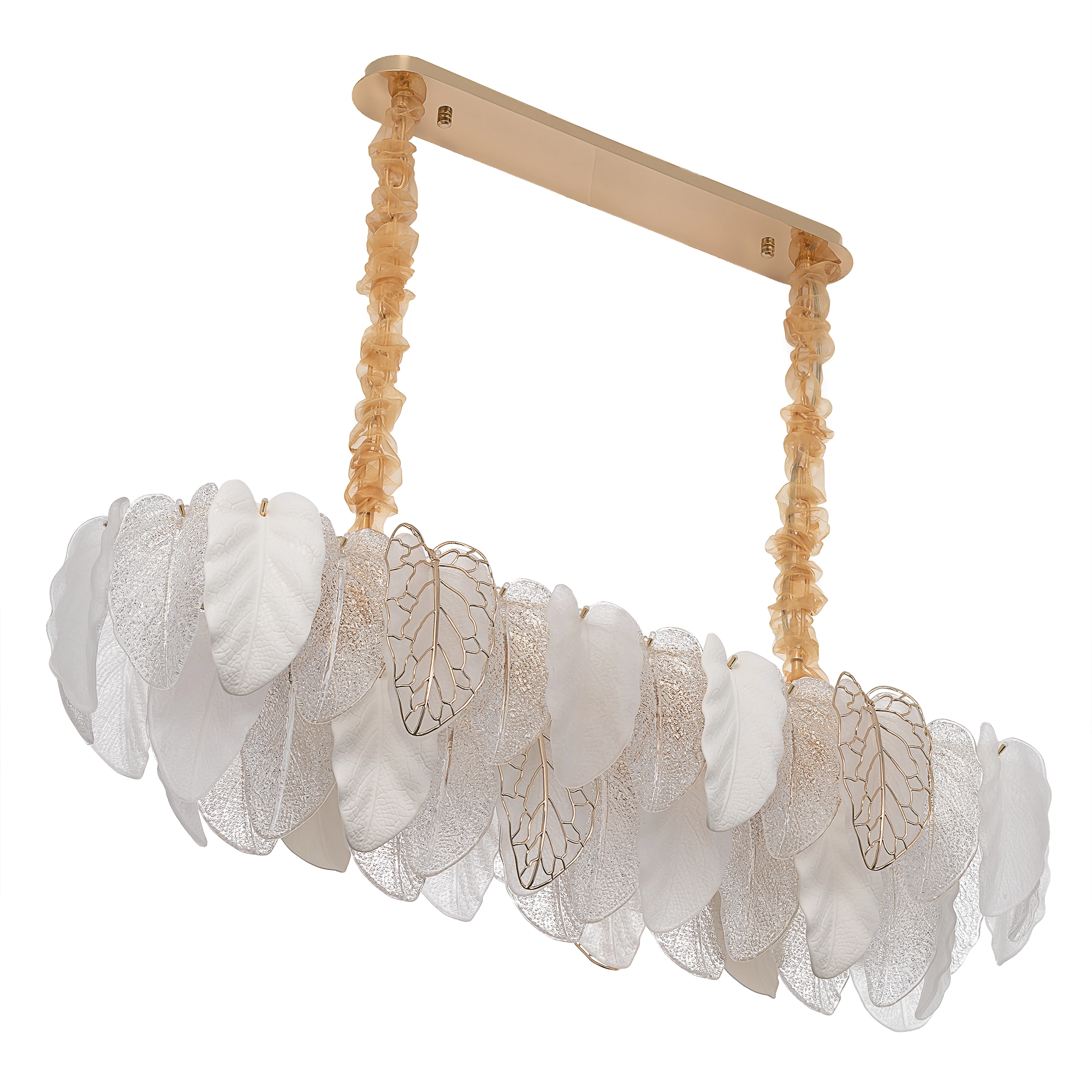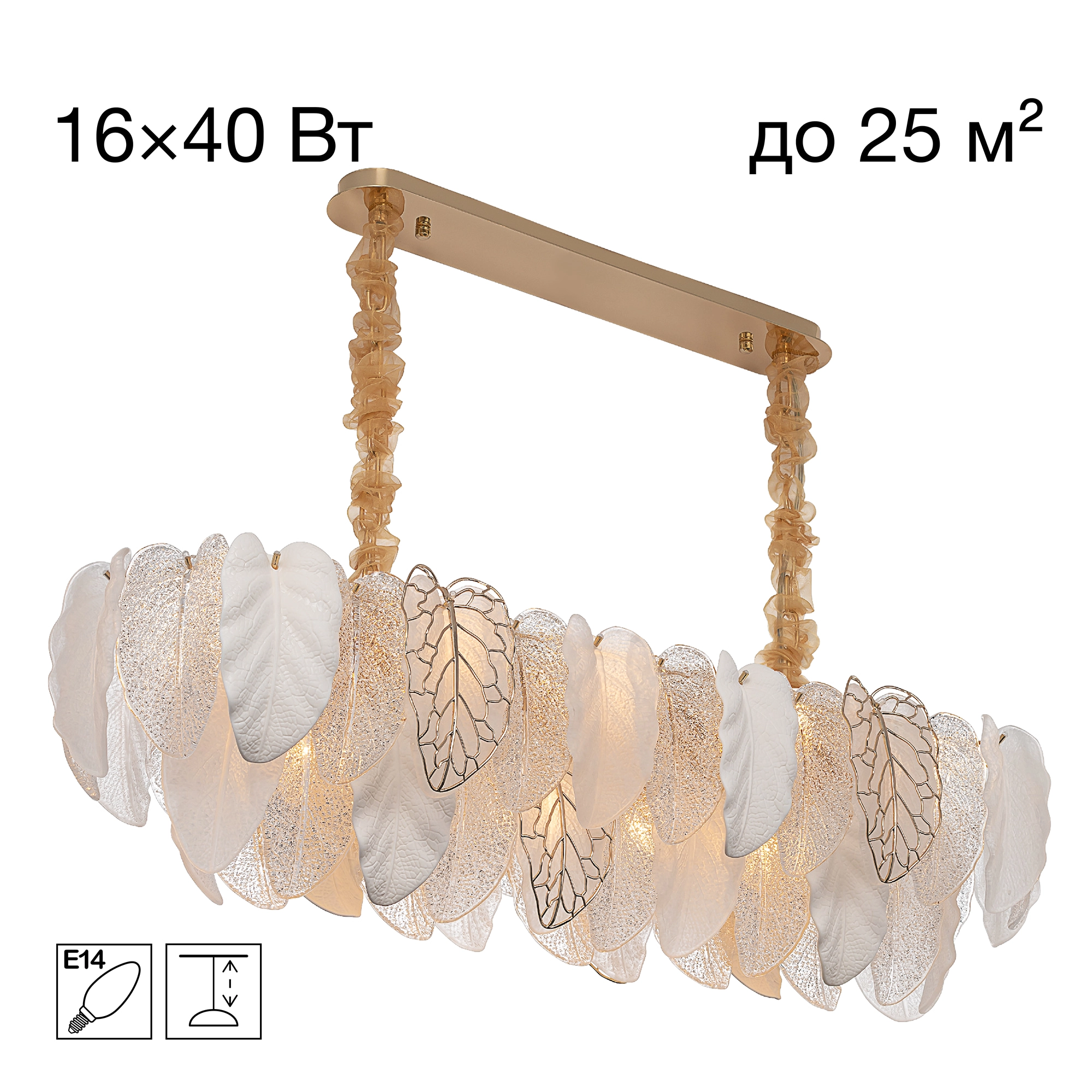 Металлический каркас золотистого оттенка переливается в лучах света. Листья из полуматового и прозрачного рифленого стекла, белой керамики, а также металлические листья с прожилками, отлитые по ювелирной технологии, подчеркивают флористическую изысканность и четкость силуэта люстры. В изделии используются 16 лампочек с цоколем Е14, высоту подвесных цепей можно отрегулировать.