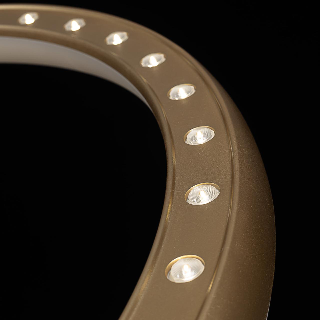 Люстра на тросах в форме каскада из трех подвесных колец, высоту и угол наклона каждого из которых можно изменить. Корпус изготовлен из прочного полимера золотистого оттенка, рассеиватель — оптический полимер. Крепление люстры подходит для всех типов потолков, в том числе натяжных. Тип крепления — планка. Суммарная мощность светильника 170Вт, световой поток 12500Лм.