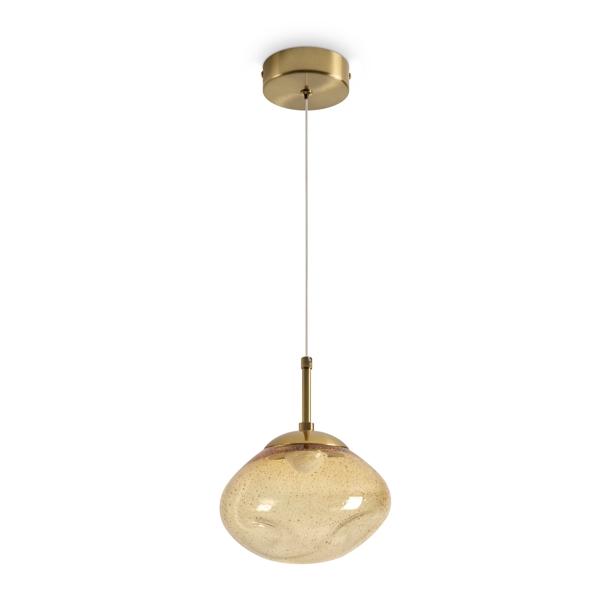 Арматура — металл. Стеклянные плафоны с пузырьками в трёх цветах: дымчатый, прозрачный, янтарный. Интегрированный LED источник света 3000К, Ra 80, угол 180°. Высота регулируется.