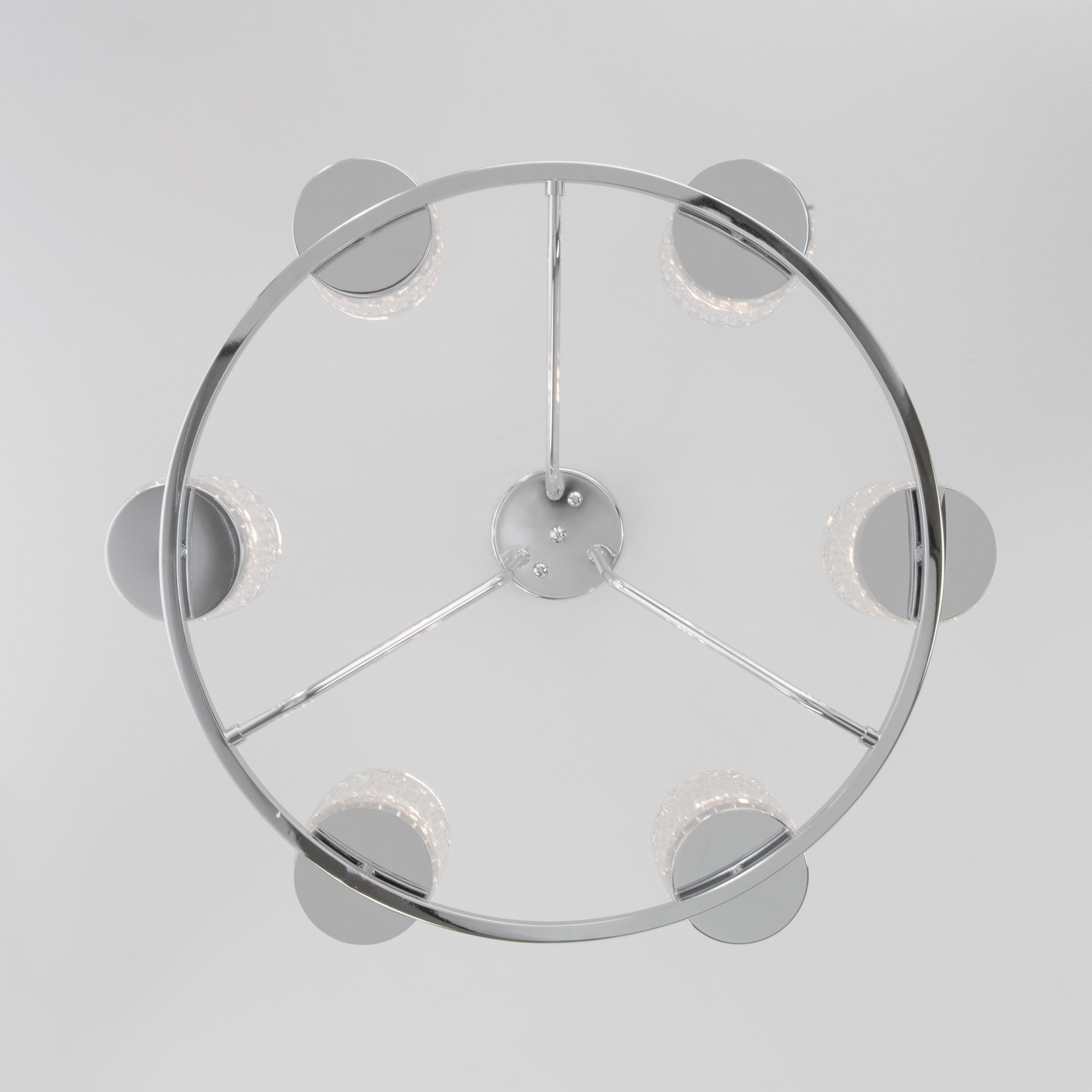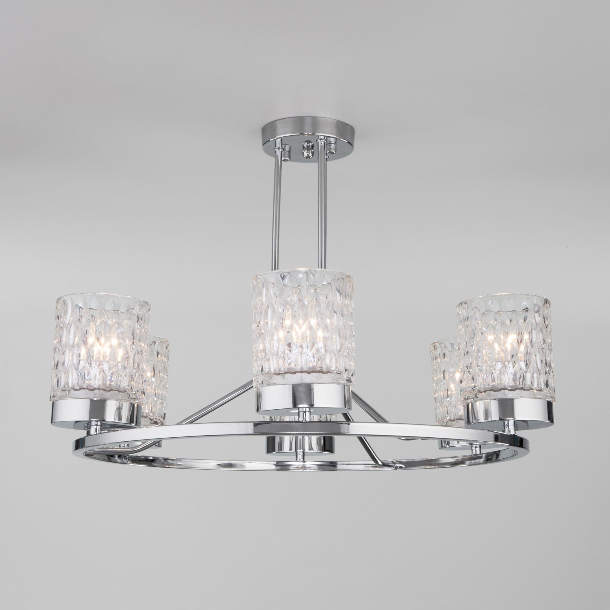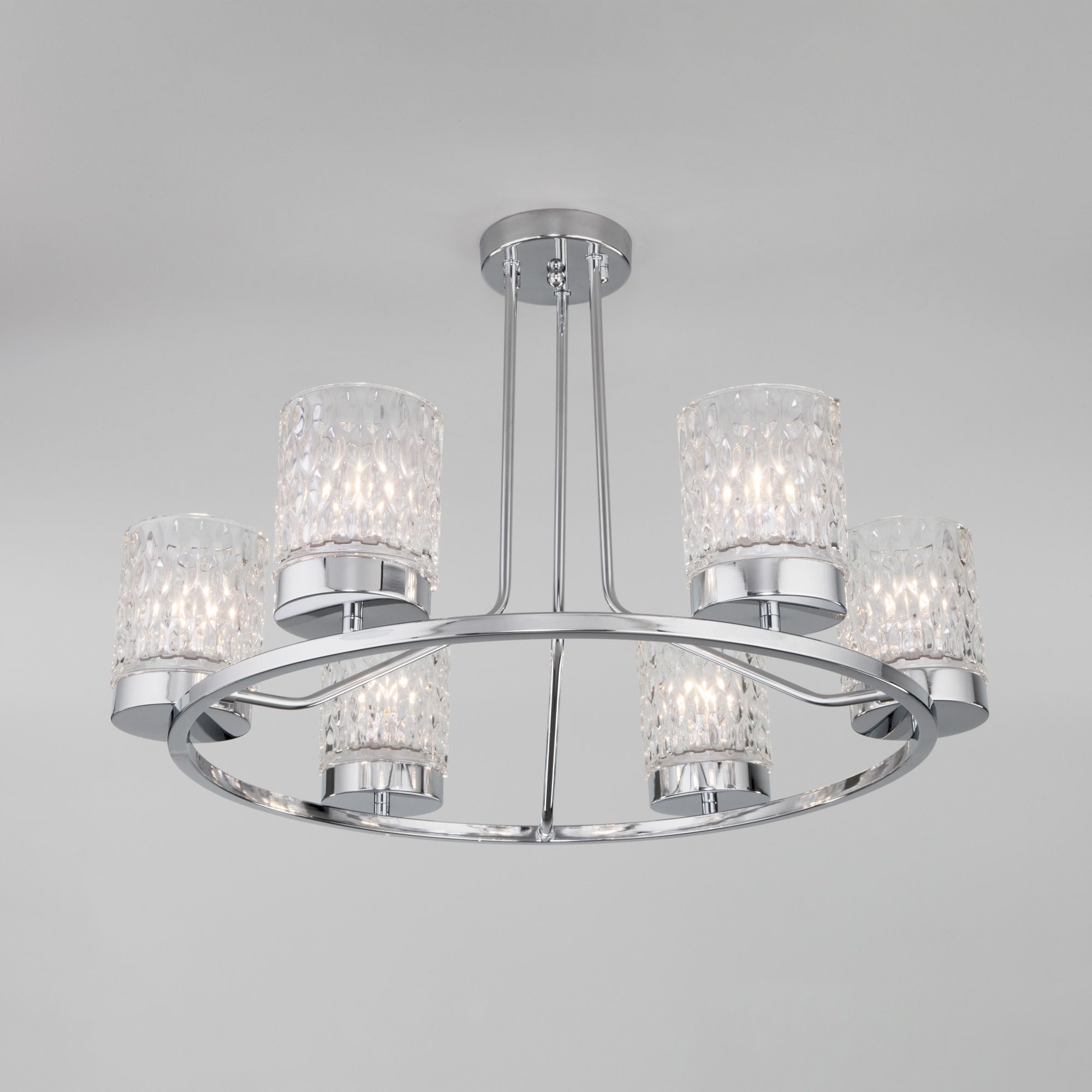 Организовать качественное освещение вам поможет эффектная потолочная люстра со стеклянными плафонами в цвете хром. Простые минималистичные формы и сдержанные тона станут идеальным дополнением для вашего помещения.