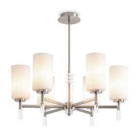 Металлическая арматура: латунь или никель (новинка серии).Белые стеклянные плафоны цилиндрической формы, направленные вверх.. Хрустальное основание с акриловыми каплями. Лампа E27.