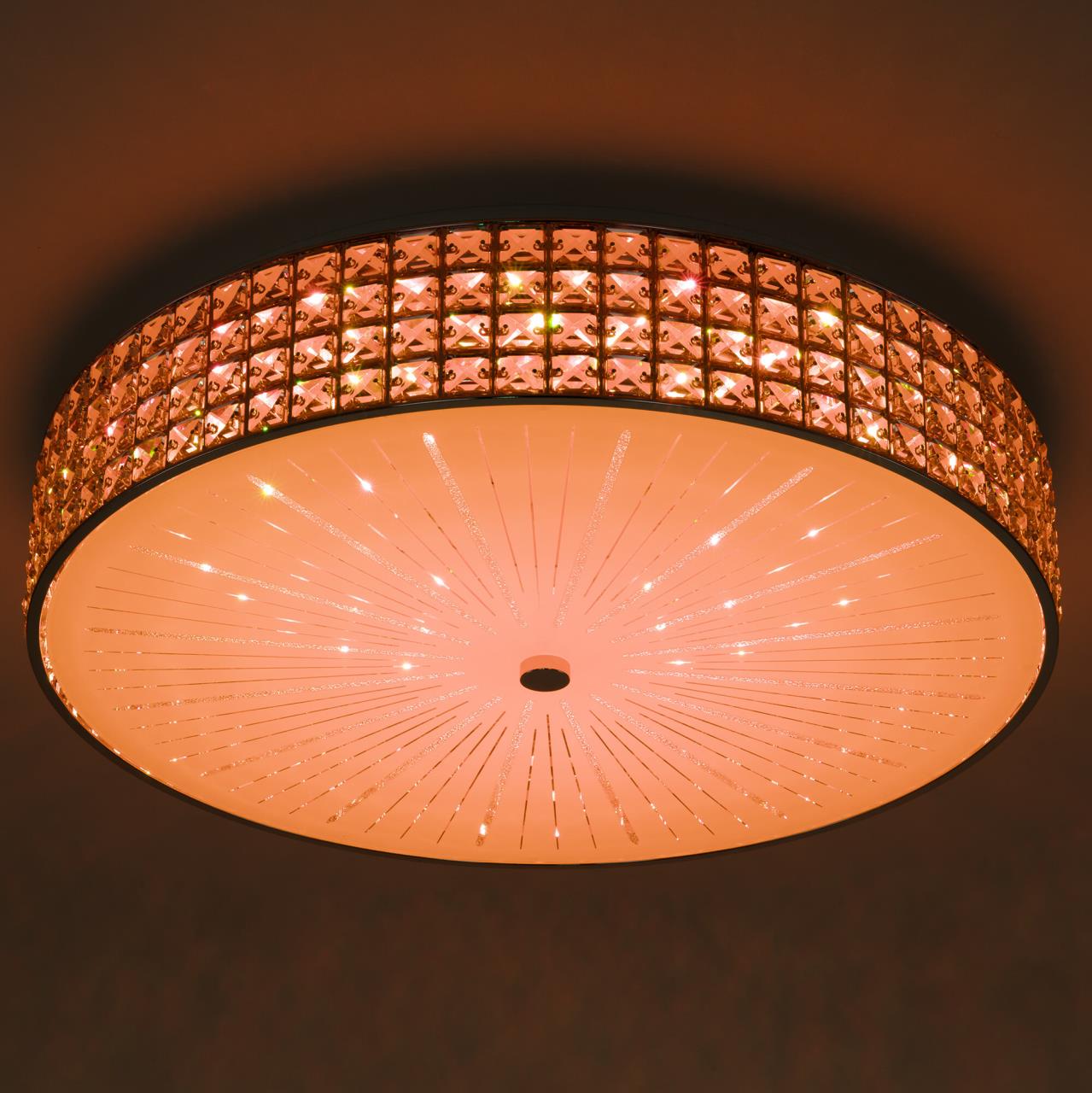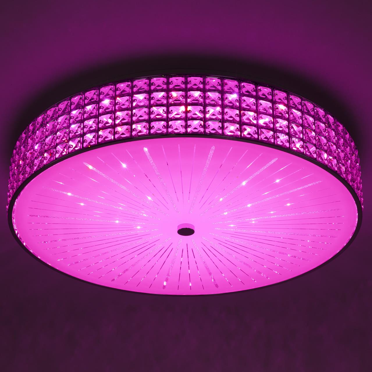 В изделии установлены яркие светодиоды основного света и цветной RGB подсветки. С помощью пульта доступно: плавная регулировка яркости от 10 до 100%, управление цветовой температурой от 3000К до 5500К позволяет настроить любые оттенки теплого, нейтрального или холодного света. Цветная RGB подсветка имеет различные режимы работы. Есть функция отсроченного выключения, 4 настраиваемых режима памяти, которыми также можно управлять настенным выключателем. Пульт ДУ в комплекте, тип батареек ААА (батарейки в комплект не входят, приобретаются отдельно). Подходит для всех типов потолков, в том числе натяжных. Тип крепления – планка. Мощность изделия 105Вт, световой поток 8400Лм. Свет безопасный для глаз, без мерцания и пульсаций.
