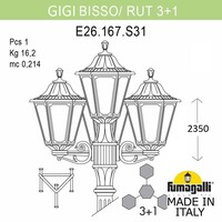 Садово-парковый фонарь FUMAGALLI серии RUT, модель RUT /GIGI/BISSO 3+1. Парковый торшер, столб GIGI с тремя уличными фонарями RUT на двух малых консолях BISSO и одним светильником по центру, на опоре. Используются для архитектурного и ландшафтного освещения в стиле "классика". Место установки столбиков освещения - парковые дорожки, cкверы, садовые участки, тротуары, а так же ландшафтные и архитектурные объекты. Могут устанавливаться и внутри помещений в качестве декоративных уличных фонарей. Изготовлены в Италии, по уникальным технологиям "FUMAGALLI" из современного композитного полимера RESIN. Этот материал в 5 раз прочнее металла, не ржавеет, не окисляется, не выгорает на солнце, его не нужно красить. Все светильники пыле-влаго защищены по стандарту IP55 (Пылезащищенные, защита от водяных струй с любого направления). Рассеиватель выполнен из антивандального, не мутнеющего и не горючего PMMA (ПолиМетилМетаАкрилат). Срок службы светильника - не менее 20 лет. Температура использования от -60 до +90. В серии RUT есть фонари в настенном (BISSO/ RUT, OFIR/ RUT, MIRRA/ RUT, PORPORA/ RUT) подвесном (SICHEM/ RUT) и наземном исполнении (MINILOT/ RUT, MIZAR.R/ RUT, IAFAET.R/ RUT, ALOE.R/ RUT, ARTU/ RUT, GIGI/ RUT, RICU/ RUT, RICU/ISSO/ RUT 2L, NEBO/ RUT, NEBO OFIR/ RUT 2L, NEBO OFIR/ RUT 3L) со столбами разной высоты, с разным количеством и конфигурацией голов. Консоли настенных фонарей и кронштейны светильников на столбах освщения могут устанавливаться вверх/вниз. Столбы выше 150 см имеют в основе мощную стальную трубу с двойной оцинковкой. При заказе требуется выбрать цвет корпуса, цвет плафона и тип патрона. По стилю и дизайну серия уличных светильников RUT похожа на светильники малого размера серии ANNA и на светильники большого размера серии NOEMI.