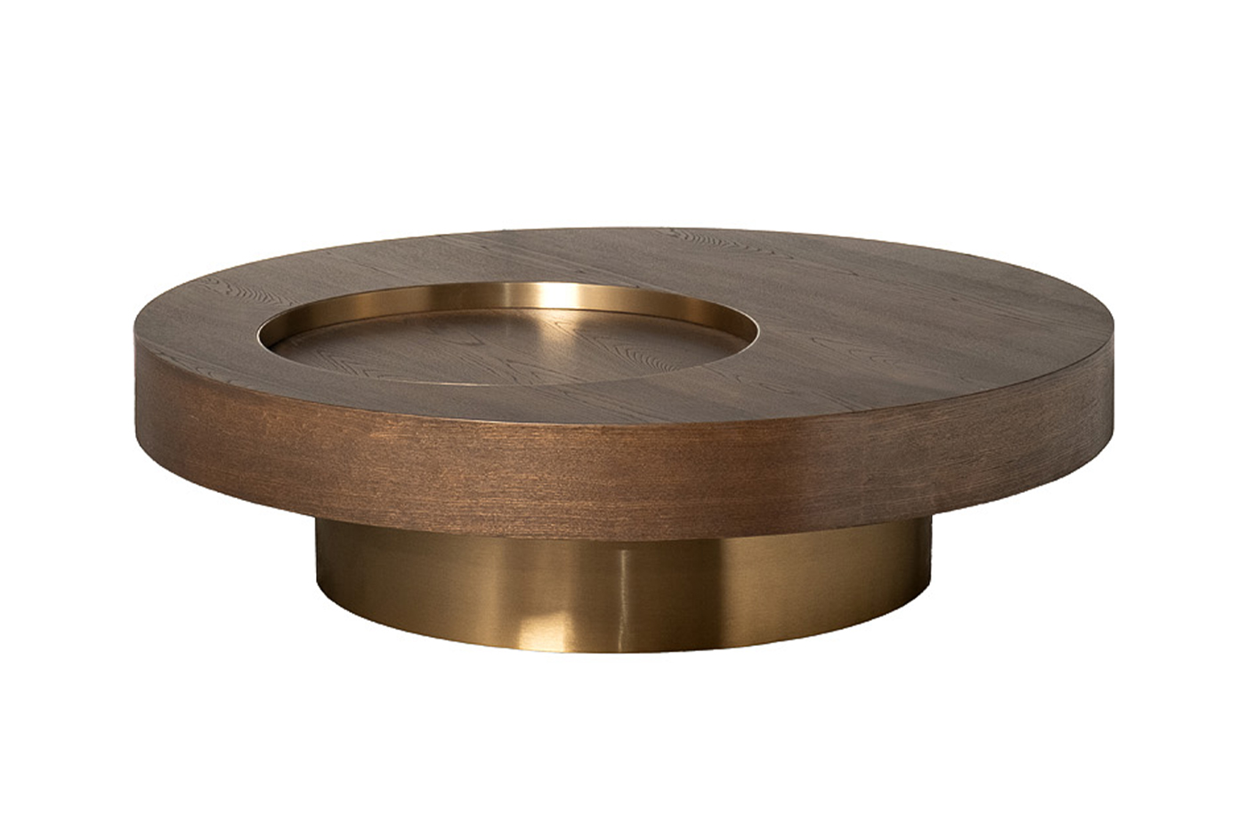 Роскошный круглый журнальный стол станет центром притяжения в гостиной или холле, оформленном в современном стиле. Столешница выполнена из МДФ, отделанного шпоном из натурального дерева. Благородная фактура дерева и теплый оттенок мокко создают ощущение уюта, а встроенная по центру столешницы круглая ниша служит для хранения пультов, журналов или подставки под чашки, бокалы. Массивная круглая опора цвета матового золота придает столу устойчивость и подчеркивает геометрию дизайна.