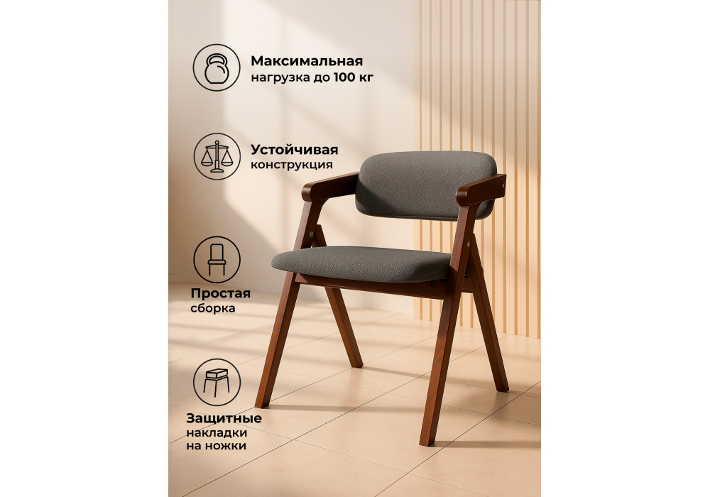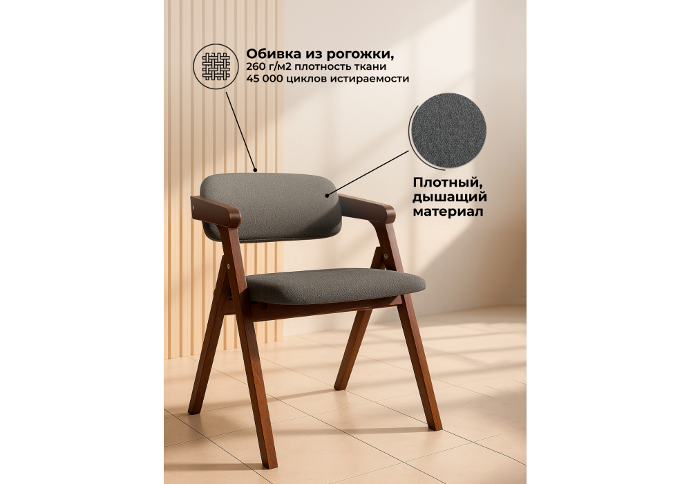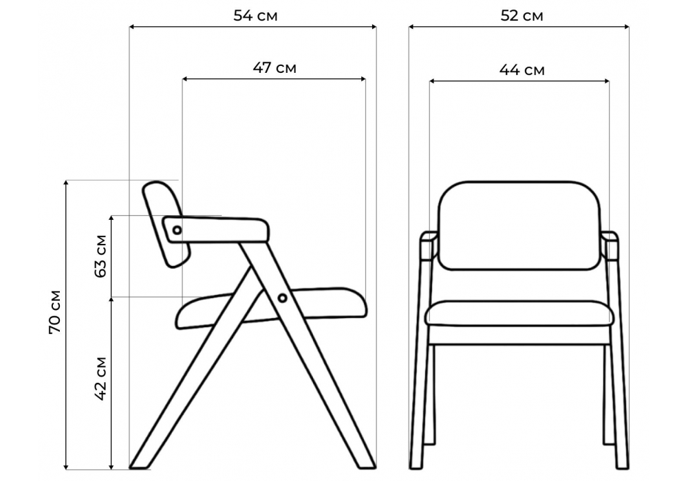 Материал каркаса - дерево; Материал сиденья - ткань; Материал обивки - ткань; Ширина - 52; Глубина - 54; Высота - 70; Ширина сиденья - 44; Глубина сиденья - 47; Высота сиденья - 42;