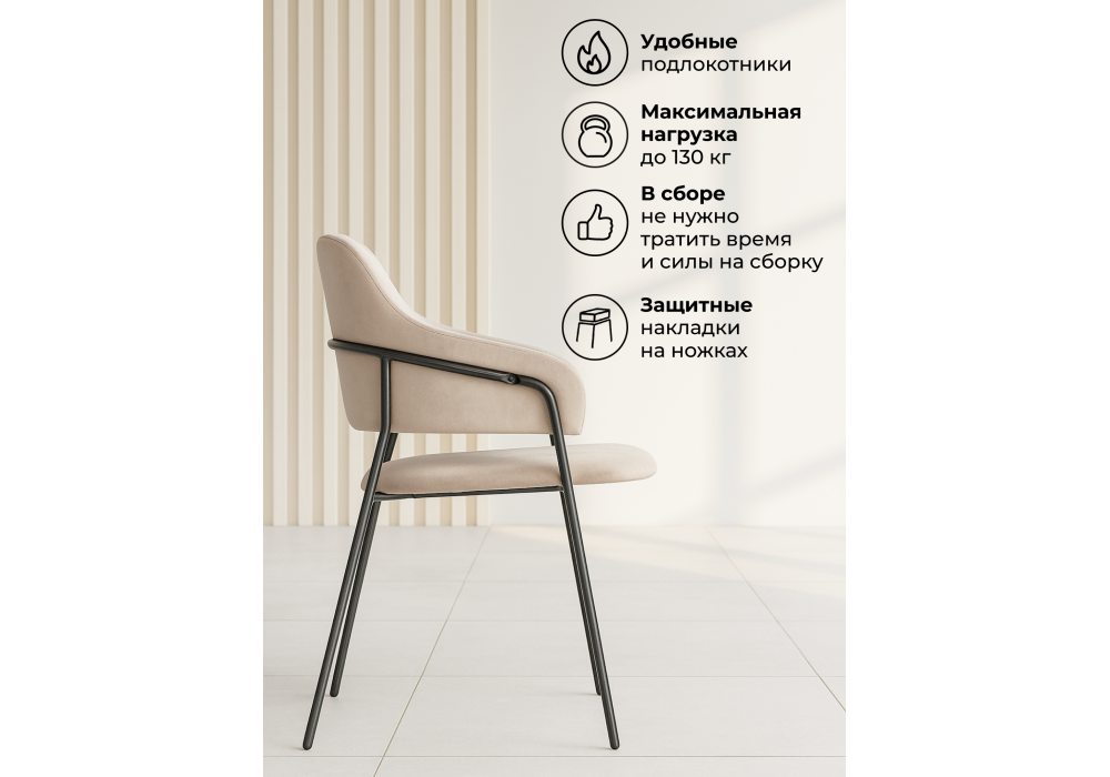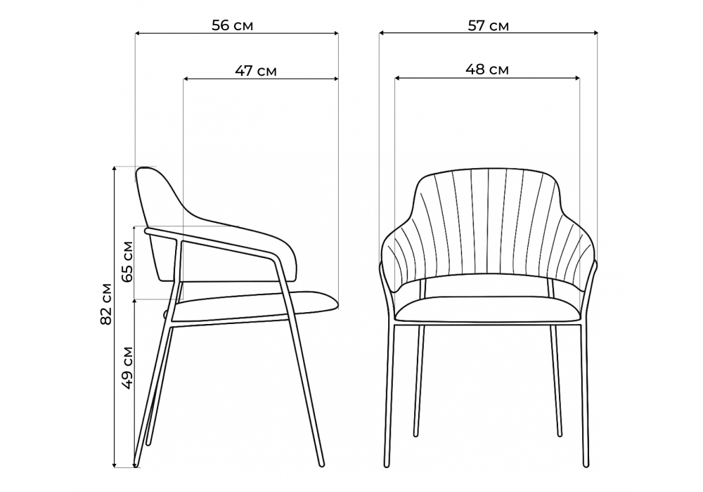 Высота подлокотников: 65 см. Материал каркаса - металл; Материал сиденья - велюр; Материал обивки - велюр; Ширина - 57; Глубина - 56; Высота - 82; Ширина сиденья - 48; Глубина сиденья - 47; Высота сиденья - 49;
