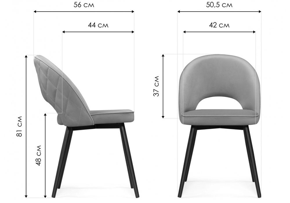 Материал каркаса - металл; Материал сиденья - велюр; Материал обивки - велюр; Цвет ножек - черный; Ширина - 50; Глубина - 56; Высота - 81; Ширина сиденья - 42; Глубина сиденья - 44; Высота сиденья - 48;