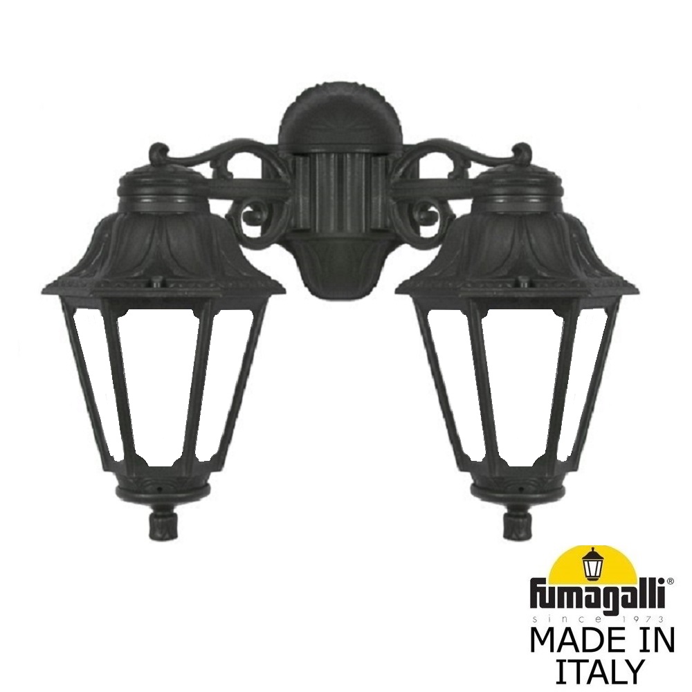 Светильники уличные настенные FUMAGALLI серии ANNA, модель PORPORA/ANNA DN. Консольный уличный светильник из 2-х фонарей ANNA, на кронштейнах BISSO малого размера, для монтажа на стену. Установка консолей "вниз". Используются для фасадного и архитектурного освещения в стиле "классика". Место установки уличных светильников - фасады, колонны и другие вертикальные поверхности исторических зданий, котеджей, загородных домов, церквей, а так же, другие места где требуется и возможна установка фонарей. Изготовлены в Италии, по уникальным технологиям "FUMAGALLI" из современного композитного полимера RESIN. Этот материал в 5 раз прочнее металла, не ржавеет, не окисляется, не выгорает на солнце, его не нужно красить. Все светильники пыле-влаго защищены по стандарту IP55 (защита от пыли, защита от струй воды, падающих под любым углом). Рассеиватель выполнен из антивандального, не мутнеющего и не горючего PMMA (ПолиМетилМетаАкрилат). Срок службы светильника - не менее 20 лет. Температура использования от -60 до +90. В серии ANNA есть фонари в настенном (BISSO/ANNA, PORPORA/ANNA) подвесном (SICHEM/ANNA, SICHEM/ANNA 3L) и наземном исполнении (IAFAET.R/ANNA, ALOE.R/ANNA, ARTU/ANNA, GIGI/ANNA, RICU/ANNA, RICU/ISSO/ANNA 1L, RICU/ISSO/ANNA 2L, RICU/ISSO/ANNA 3L) со столбами разной высоты, с разным количеством и конфигурацией голов. Консоли настенных фонарей и кронштейны светильников на столбах освщения могут устанавливаться вверх/вниз. Столбы выше 150 см имеют в основе мощную стальную трубу с двойной оцинковкой. При заказе требуется выбрать цвет корпуса, цвет плафона и тип патрона. Возможен светодиодный вариант с LED цоколем GX-53. По стилю и дизайну серия уличных светильников ANNA похожа на светильники среднего размера серии RUT и на светильники большого размера серии NOEMI. По размеру ANNA относится к малым светильникам как серия SABA и GLOBE 250.
