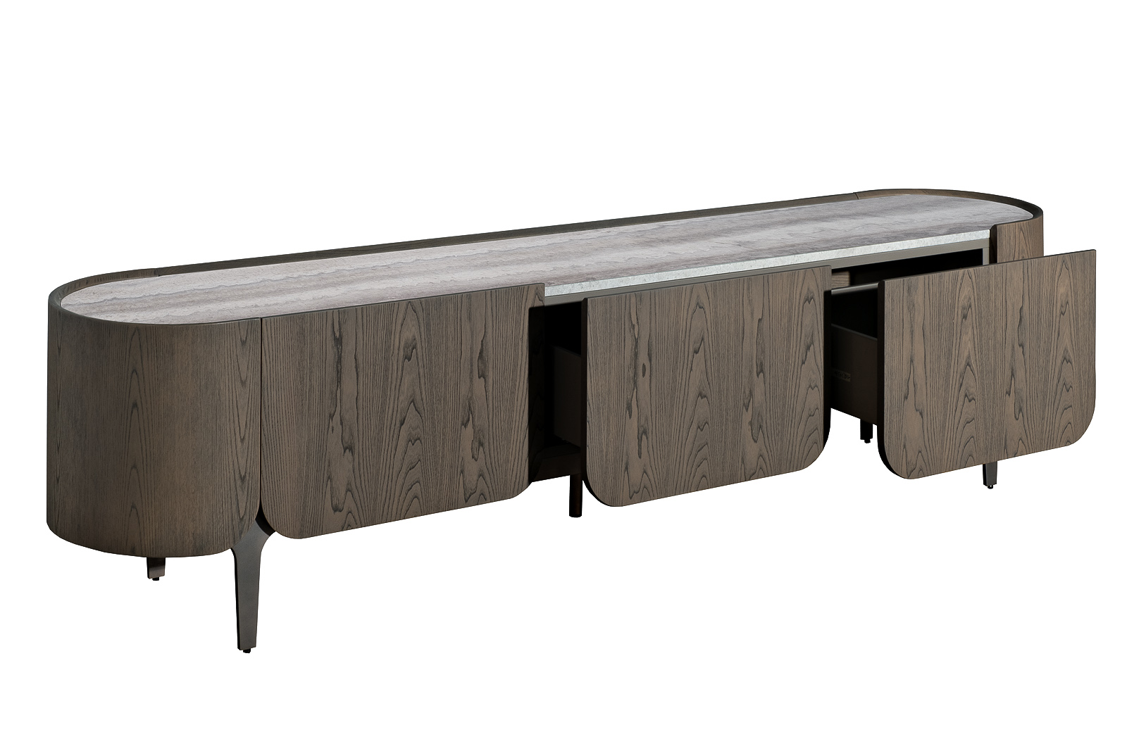 Тумба под телевизор Travertine — это элегантное решение для современной гостиной, где важны стиль и визуальный баланс. Эта тумба под телевизор со столешницей из травертина подчёркивает статус интерьера за счёт столешницы из натурального камня с выразительной природной фактурой. Корпус из МДФ с отделкой шпоном и меламином создаёт тёплый благородный контраст, а металлические ножки придают конструкции лёгкость и архитектурную чёткость. Дизайнерская ТВ тумба премиум гармонично вписывается в интерьеры в стиле modern luxury, минимализм и современная классика, формируя аккуратную и эстетически выверенную ТВ-зону.