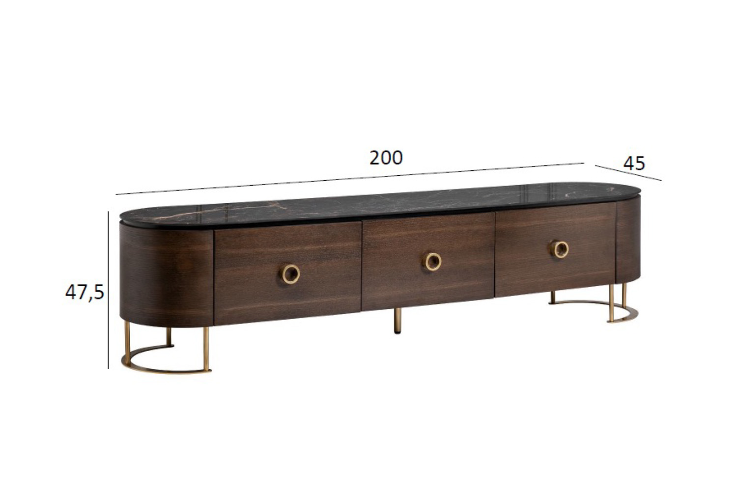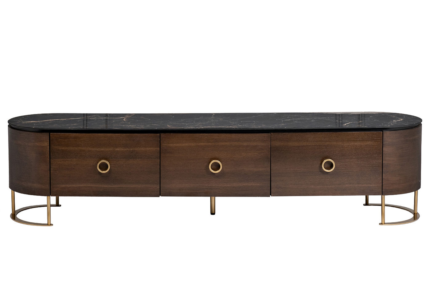 Аристократичная длинная тумба под телевизор – эффектное и практичное решение для гостиной или спальни. Она позволяет организовать удобное хранение вещей, техники и документов, и при этом является красивой подставкой под телевизор, интерьерный декор. Благодаря классическому коричневому цвету тумба под ТВ легко вписывается в интерьер гостиной, гармонирует с другой современной мебелью обстановки. Особенности модели – столешница из керамогранита с мраморным рисунком, полукруглые опоры и фурнитура из металла с эффектом позолоты. Компания Garda Decor предлагает купить тумбу под телевизор с доставкой по РФ, а также любую другую мебель в стилистике ар-деко.