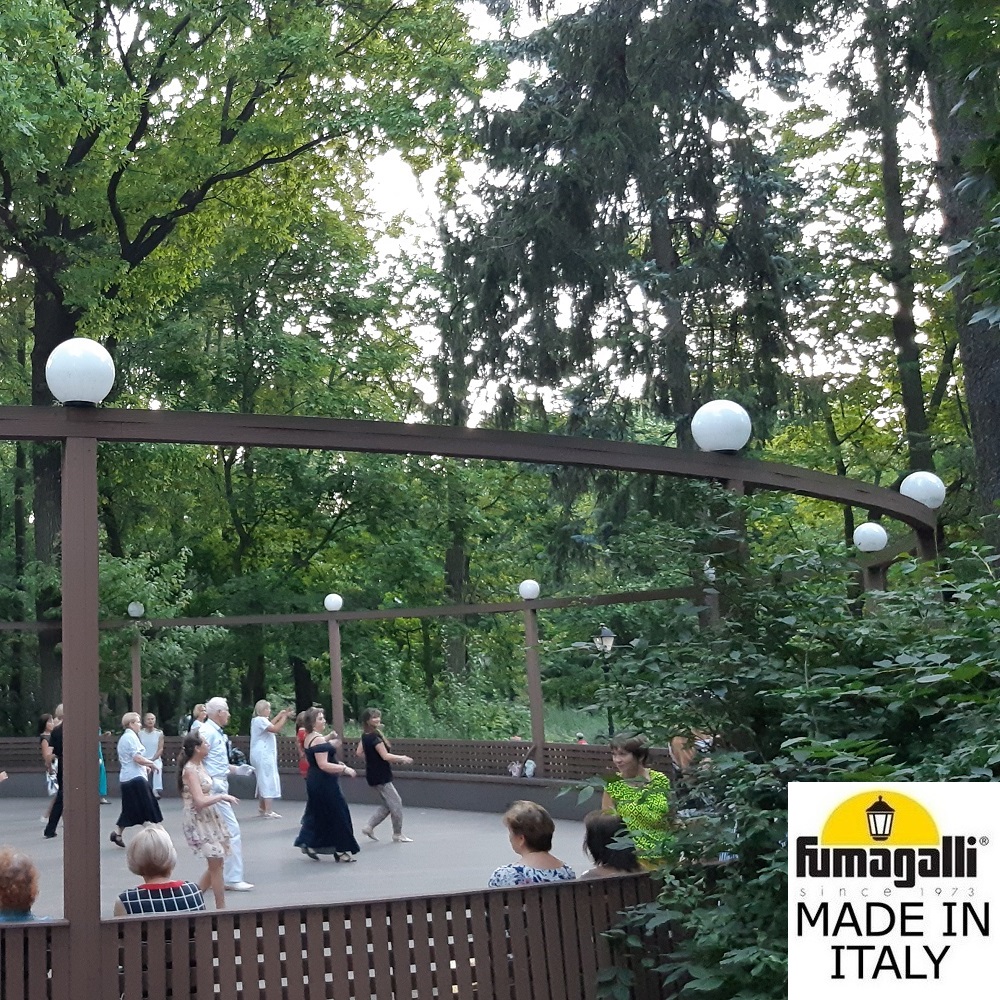 Уличные фонари на столб FUMAGALLI серии GLOBE 250, модель GLOBE 250. Только фонарь (голова), посадочный диаметр D=60мм., устанавливаются на столб или трубу соответствующего диаметра. Используются для архитектурного и ландшафтного освещения в стиле "классика". Место установки уличных светильников - опоры освещения, столбы заборов, ландшафтные композиции в парках и скверах. Изготовлены в Италии, по уникальным технологиям "FUMAGALLI" из современного композитного полимера RESIN. Этот материал в 5 раз прочнее металла, не ржавеет, не окисляется, не выгорает на солнце, его не нужно красить. Все светильники пыле-влаго защищены по стандарту IP55 (Пыленепроницаемые, защита от водяных струй с любого направления). Рассеиватель выполнен из антивандального, не мутнеющего и не горючего PMMA (ПолиМетилМетаАкрилат). Срок службы светильника - не менее 20 лет. Температура использования от -60 до +90. В серии GLOBE 250 есть фонари в настенном (BISSO/GLOBE 250, OFIR/GLOBE 250, MIRRA/GLOBE 250, PORPORA/GLOBE 250) подвесном (SICHEM/GLOBE 250) и наземном исполнении (IAFAET.R/GLOBE 250, ALOE.R/GLOBE 250, ARTU/GLOBE 250, GIGI/GLOBE 250, RICU/GLOBE 250, RICU/ISSO/GLOBE 250 1L, RICU/ISSO/GLOBE 250 2L, RICU/ISSO/GLOBE 250 3L) со столбами разной высоты, с разным количеством и конфигурацией голов. Консоли настенных фонарей и кронштейны светильников на столбах освщения могут устанавливаться вверх/вниз. Столбы выше 150 см имеют в основе мощную стальную трубу с двойной оцинковкой. При заказе требуется выбрать цвет корпуса, цвет плафона и тип патрона. По стилю и дизайну серия уличных светильников GLOBE 250 похожа на светильники большого размера GLOBE 400 и на светильники среднего размера GLOBE 300.