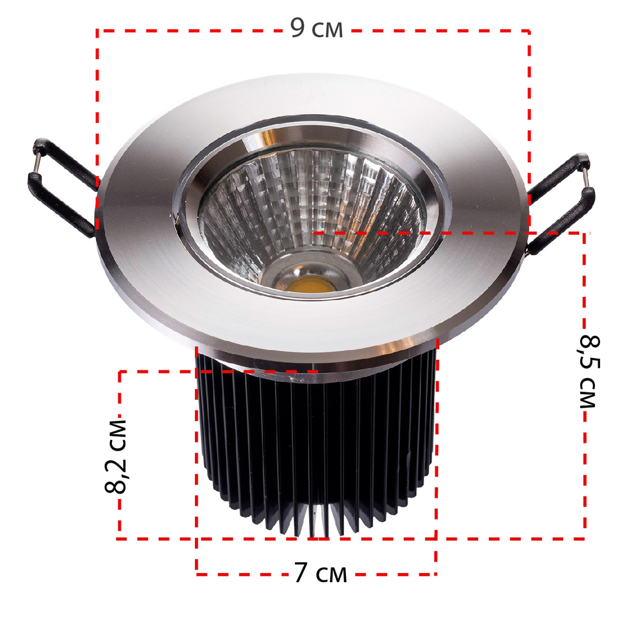 Арматура светильника выполнена из сплава алюминия, отполирована и покрыта прозрачным защитным лаком. По краю снята декоративная фаска. Светодиоды закрыты прозрачным стеклом. Клипсы с прорезиненным покрытием.